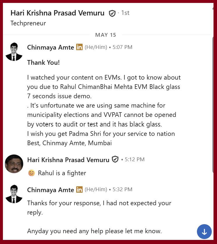 Hello Sir, the โcell phoneโ theory doesnโt hold much meaning because we have VVPAT. Every voter can visually verify their vote on the printed slip. So if someone is raising concerns but never talks about the possibility of paper-slip manipulation, the argument isnโt complete. Please watch this video by Rahul Chimanbhai Metha, Btech IIT Delhi : https://www.youtube.com/watch?v=wGmCTki8wqE